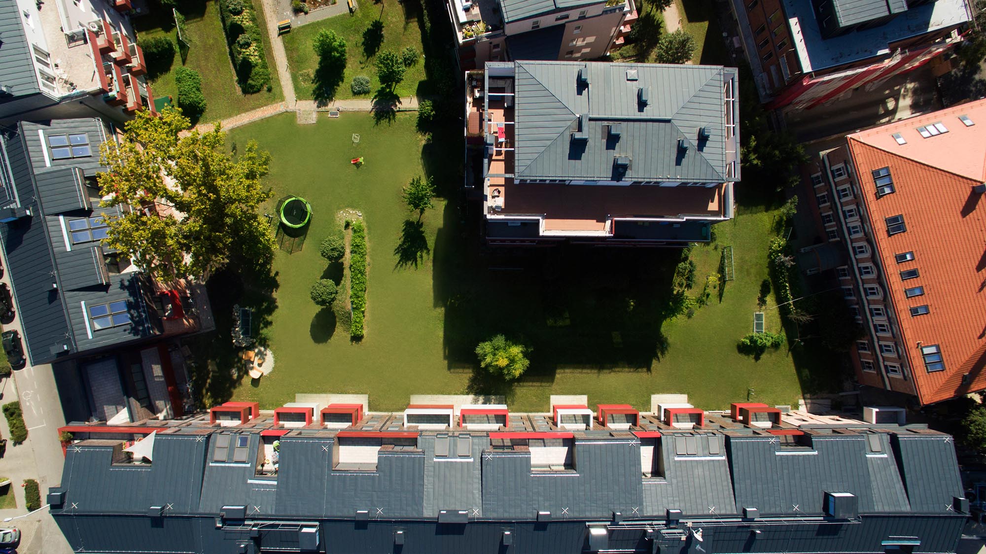 A pinceszinten garázsok, tárolók és raktárhelyiségek találhatók, a földszinten iroda-, bérleményi helyiségek és lakások, a felsőbb szinteken lakások kerültek kialakításra.